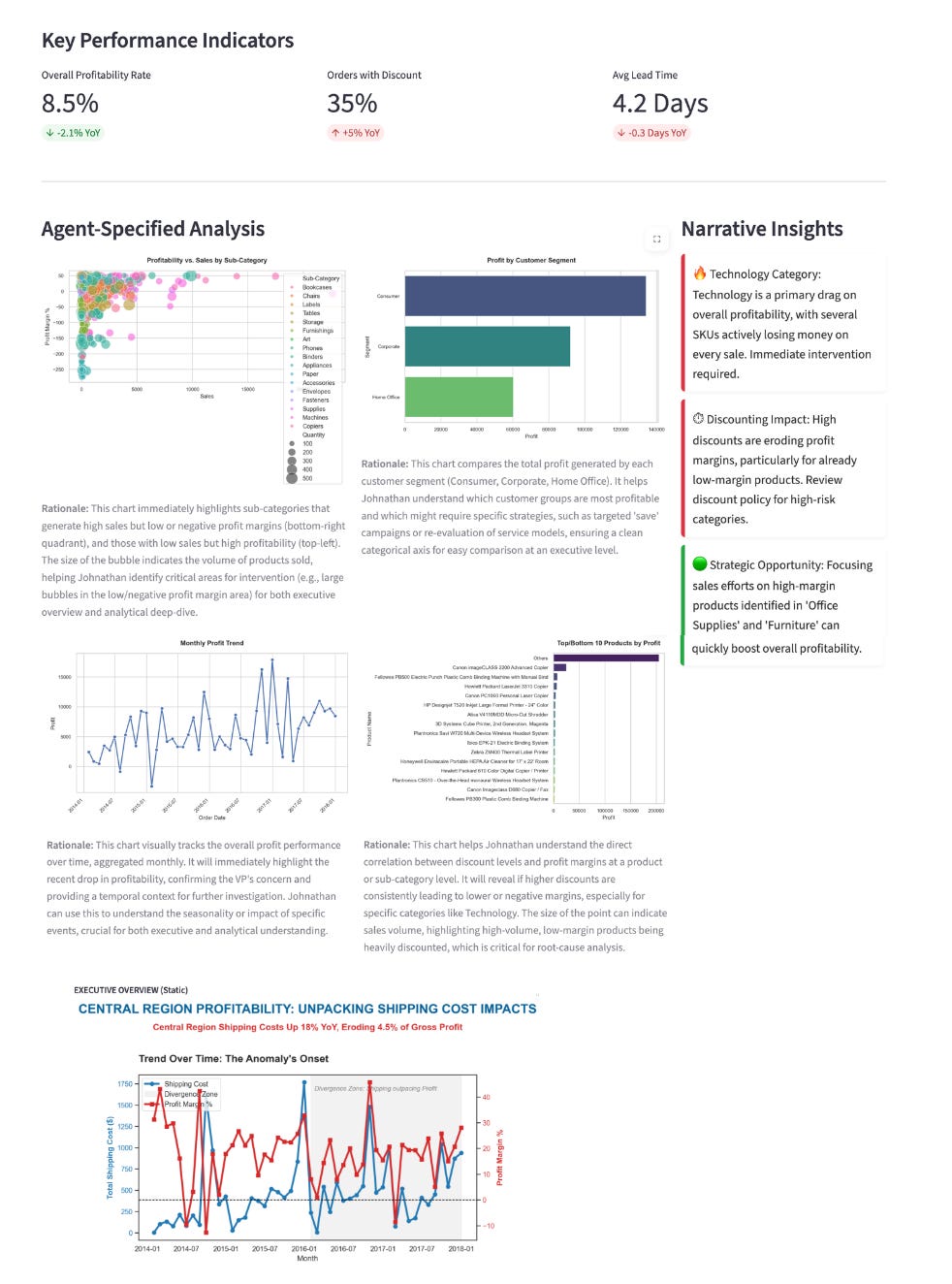 Every chart included guidance on how Johnathan should use it, what to investigate, what to prioritise, and where to act.Root causes made explicit: Narrative Insights called out “critical profit drains” rather than generic summaries.