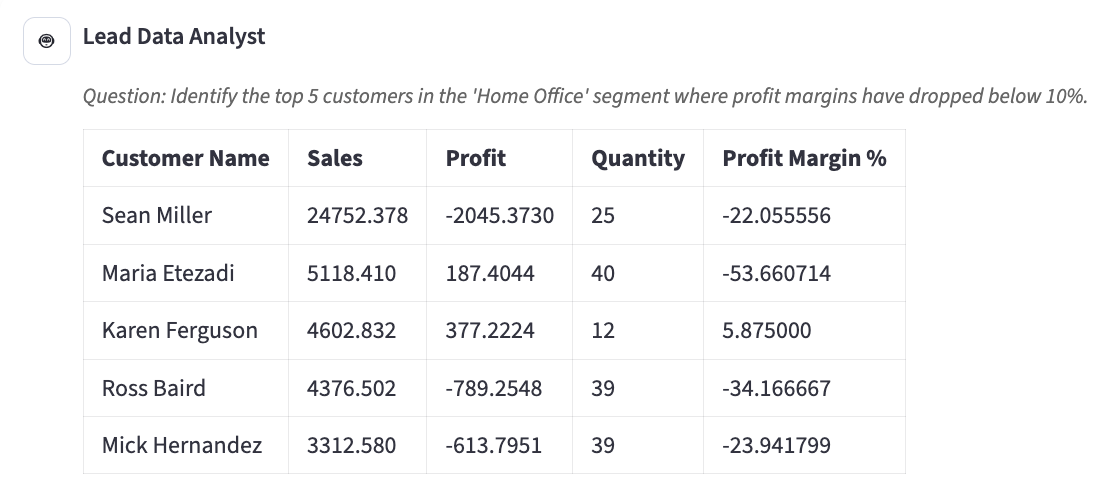 Lead Data Analyst Agent surfaced the under performing accounts as shown below: