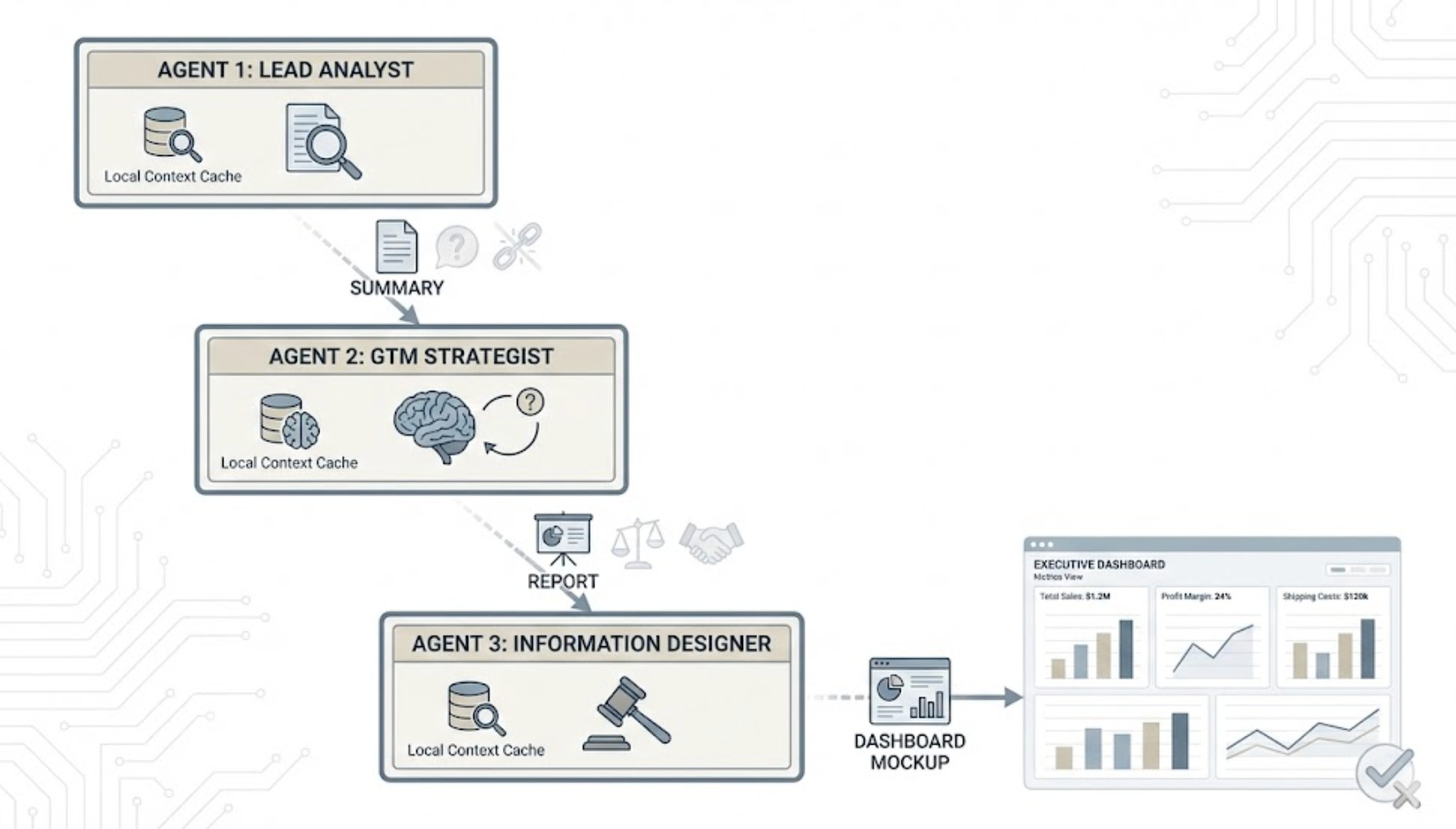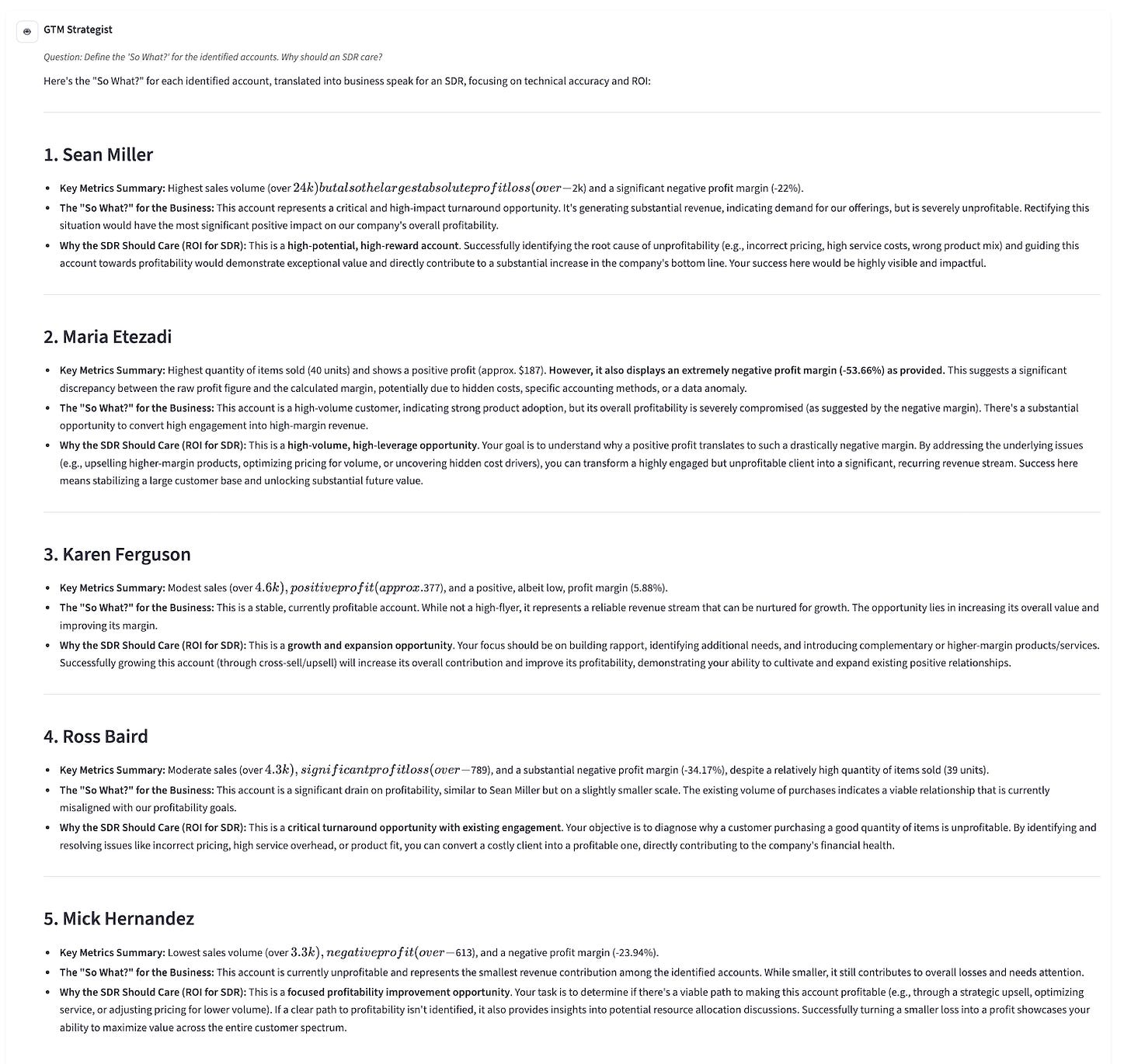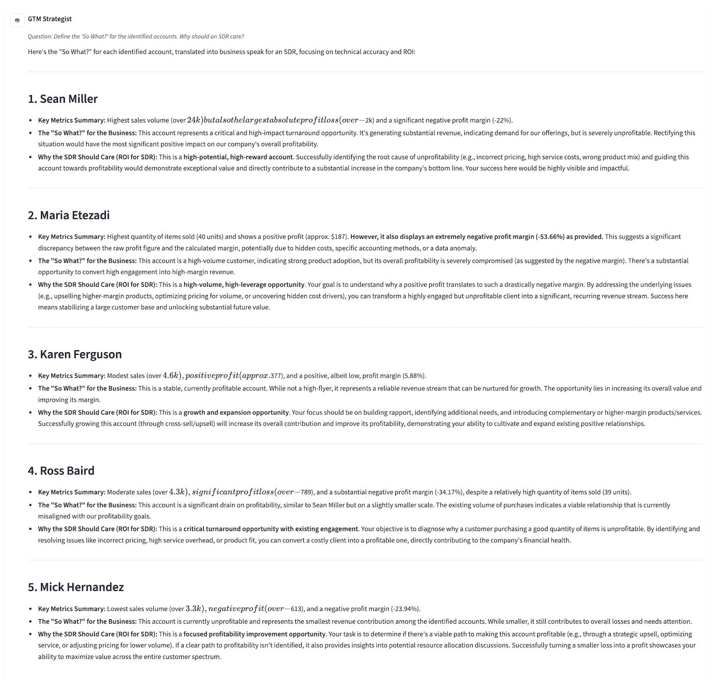 To make this concrete, an SDR-focused GTM (Go-To-Market) analysis pipeline was implemented. The goal was straightforward: identify why profitability was dropping in a specific region and help sales teams act on it. What we are seeking here is not reporting correctness but decision aiding feedback.