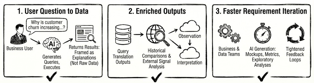 Mockups, metrics, and exploratory analyses can be generated rapidly, tightening feedback loops between business and data teams.